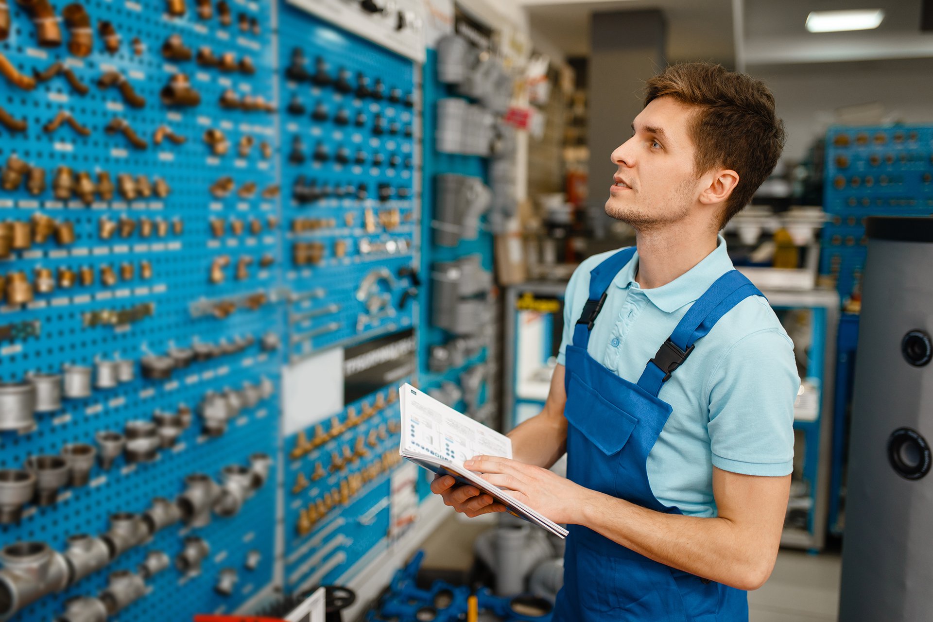 Plumber at showcase with valves and pipe adapters